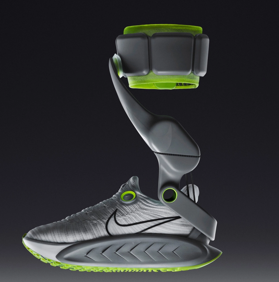 从外观来看,Amplify像是某种外骨骼设备的一部分,通过环绕脚踝的传动设备为人体运动提供助力,使得向前移动的速度和轻松度显著提升。耐克将穿着体验类比电助力自行车,这类车辆仍需要人踩踏板,同时使用电动机增强踩踏的动力。